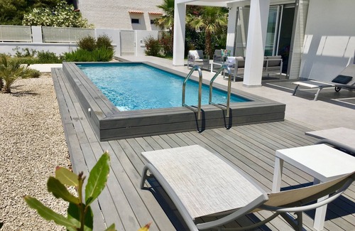 The exterior, shaded by white towels, consists of a dining area with barbecue, conversation area with sofa and armchairs and solarium area with 6 pool beds.