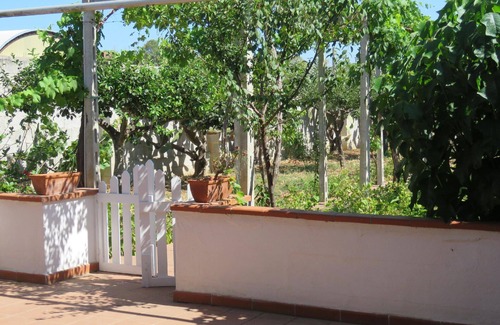 It is entirely surrounded by a high fence, the porch is furnished with table and chairs, the barbecue is masonry, and guests are free to pick fruit from the garden.