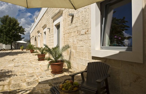 The Masseria is advisable for those who like to go to the sea or on excursions, and refresh themselves in a sober, romantic, elegant and comfortable environment, in a hilly and fresh area (300 mt lm), far from the crowded beaches. Prospectus in local stone, property is fenced, electric gate, independent alarm system for homes.