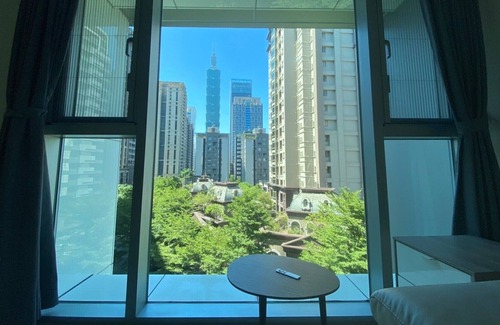 Condo which overlooks taipei 101 and is great for fireworks watching and hang out with friends. Couch is made out of real cow skin and all amenities are available.
