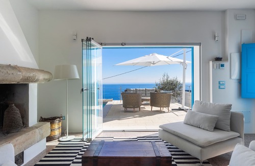 The living room features large frameless glass folding doors that open onto the terrace and swimming pool, seamlessly connecting the indoor and outdoor spaces while offering breathtaking views across the Adriatic coast. The view is mesmerizing from sunrise to sunset, as the light changes and alters the surrounding landscape.